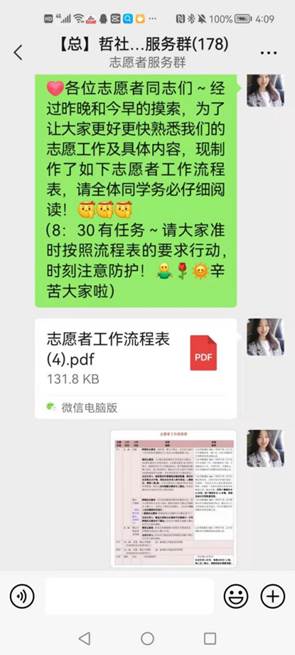 3月14日,为了第二天大家能圆满顺利地完成首次志愿工作任务,我指定了各楼层负责人,并在大家帮助下连夜制作了哲社志愿者排班表和南四公寓分布分组图,编辑了第二天要发布的所有工作通知。经过第一次送晚餐工作的摸索后,我连夜制作并发布了志愿者工作流程表,努力让我们哲社的团队变得越来越好!此后,我的主要工作任务就是作为公寓二楼负责人时刻关注二楼同学需求,作为哲社志愿者负责人在志愿时段前和老师、其他学院同学们对接,到点指引我们的最美志愿者团队有序工作,所有工作完成后走两遍楼进行最后的确认。工作确实又累又冷,但我的内心却十分火热。
