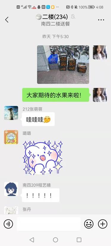 封寝当天,在学院书记和老师们的领导下,南四哲社女生组建了100多人在内的志愿者服务群,我也开始全面负责志愿者们的所有工作,扛起了这面大旗。作为哲社女生负责人,我加入了南四负责人总群,开始全面对接南四的老师,并频繁和其他学院同学沟通联络。我悄悄地立下了一个flag:一定不能辜负老师和志愿者同学们对我的期望,一定要尽力照顾到每位师姐师妹和同学们的需求,帮助南四姐妹们度过一个美好的封寝生活。