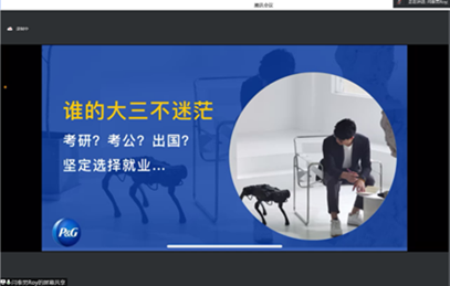 2013级本科生毕业生,现任宝洁公司市场策略与计划部高级项目经理闫泰男就“从校园到职场,我该做哪些准备”进行求职经验分享。会议由学工办主任刘畅老师主持。
