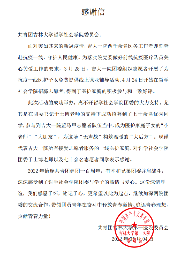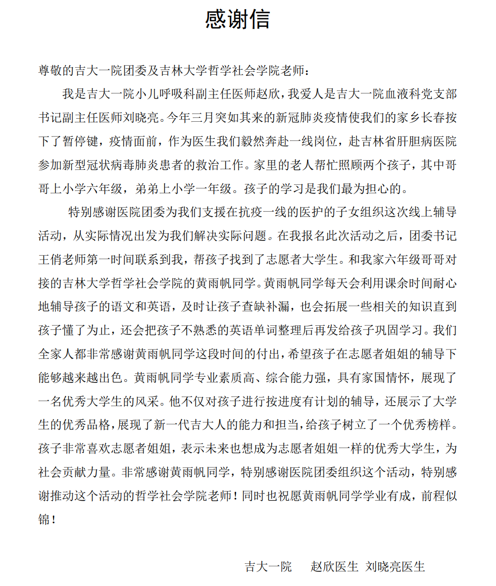 第一医院(以下简称“吉大一院”)团委和吉大一院赵医生、刘医生的感谢信。自疫情发生以来,吉大一院团委针对投身防疫一线的医务工作者子女开展线上课业辅导活动,开心鬼传媒