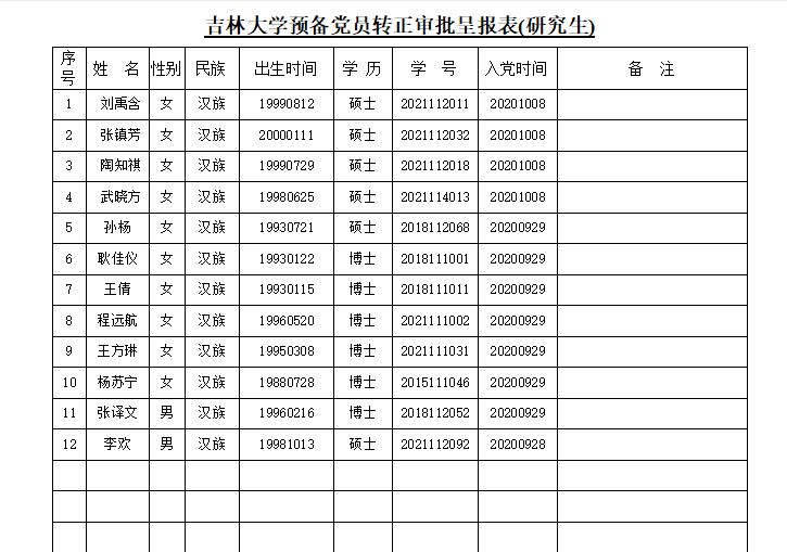 在听取党小组和党员、群众意见的基础上,经支部委员会审查,拟将刘禹含等12名同志转为中共正式党员。根据发展党员工作有关要求,现将其有关情况进行公示。