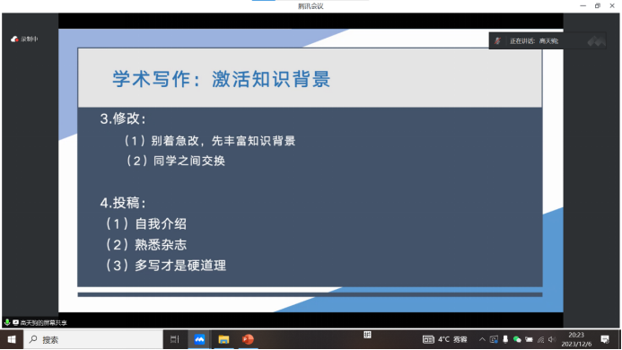 高天驹老师则重点分享了学术积累和学术写作两个方面的经验,并详细介绍了学术写作的四大流程,呼吁大家变被动为主动,形成以我为主的学习。