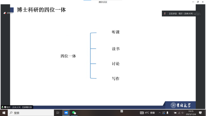 会上,主讲嘉宾们从自身经历出发,分享了科研过程中和读博期间的情绪调适方法,介绍了学术经验和压力缓解策略。程汉老师就听课、读书、讨论、写作“四位一体”的博士科研理念进行了解读,详细阐述了每个环节的方法及其重要性。