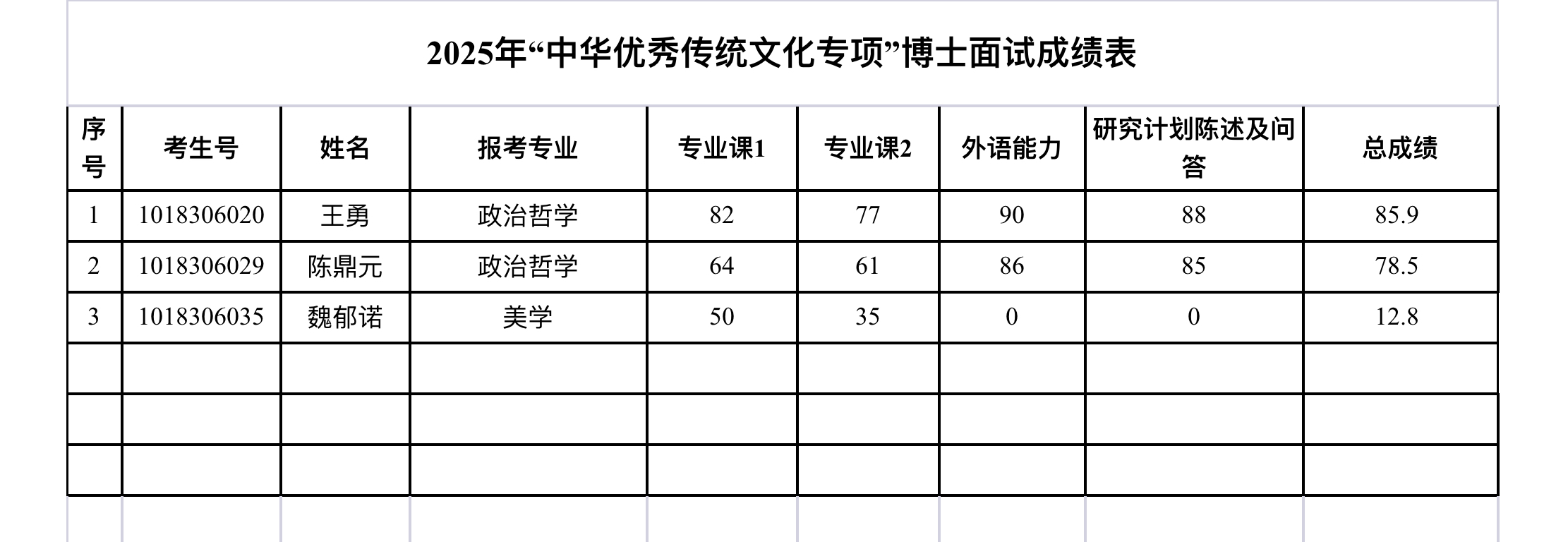 2025年“中华优秀传统文化专项”博士申请考核复试成绩参见图片