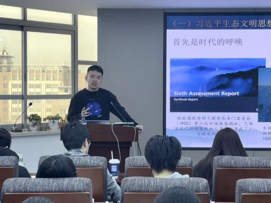 本次宣讲围绕新时代绿色发展的理论逻辑与实践路径展开,系统阐释了习近平生态文明思想的核心要义及其时代价值。主讲人尚坤首先就该思想形成的时代背景进行了详尽阐述。随后,分别从价值维度、认识维度和实践维度,解析了“十个坚持”的核心内涵,突出强调了“人与自然和谐共生”及“绿水青山就是金山银山”等重要理念,并指出该思想既继承中华优秀传统文化,又实现了对传统发展理念的深刻变革。主讲人进一步结合生态文明建设的具体实践案例与实施路径,阐述了该思想在推进中国式现代化进程中所发挥的关键作用与取得的实际成效。最后,尚坤指出,习近平生态文明思想不仅是新时代我国生态文明建设的根本遵循,也为全球环境治理提供了具有东方智慧的中国方案,展现出我国与世界各国共同构建清洁美丽世界的坚定意愿。他鼓励在场同学将理论认识与实践行动相结合,发挥专业优势,积极服务于国家振兴的伟大实践。