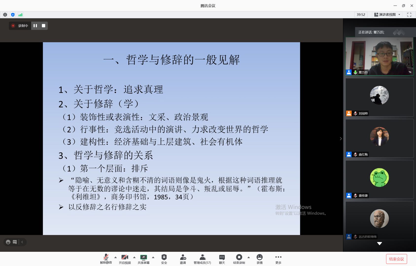 覃万历博士首先介绍了人们对哲学与修辞之间区别和联系的一般见解,指出二者既有“排斥”的一面,也有“融合”的一面,认为哲学与修辞的交叉点在于话语或语言,即“逻各斯”。接着,覃万历博士阐述了柏拉图对修辞的批评,并对柏拉图提出了批评意见,认为其哲学遮蔽了有关哲学自身的两个问题:一是“哲学如何激发行动”的问题;二是“哲学如何建构”的问题。覃万历博士以马克思的历史唯物主义为例,从马克思与历史唯物主义的人格、马克思与历史唯物主义的受众、历史唯物主义的修辞转换三个方面尝试回答“哲学如何激发行动”这一问题。覃万历博士又以《资本论》与消费社会理论为例,从《资本论》中商品的价值结构、消费社会理论的认识变化、突出/隐藏的理论建构方式三个方面尝试回答“哲学如何建构”这一问题。最后,覃万历博士简要总结了此次讲座的基本思路与核心观点,认为其研究处在哲学与修辞学的交叉领域,并将其称为“哲学修辞研究”。他认为哲学修辞研究根本上是反思性的,是对哲学本身的反思,这势必改变哲学的自我理解。