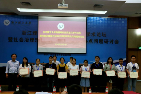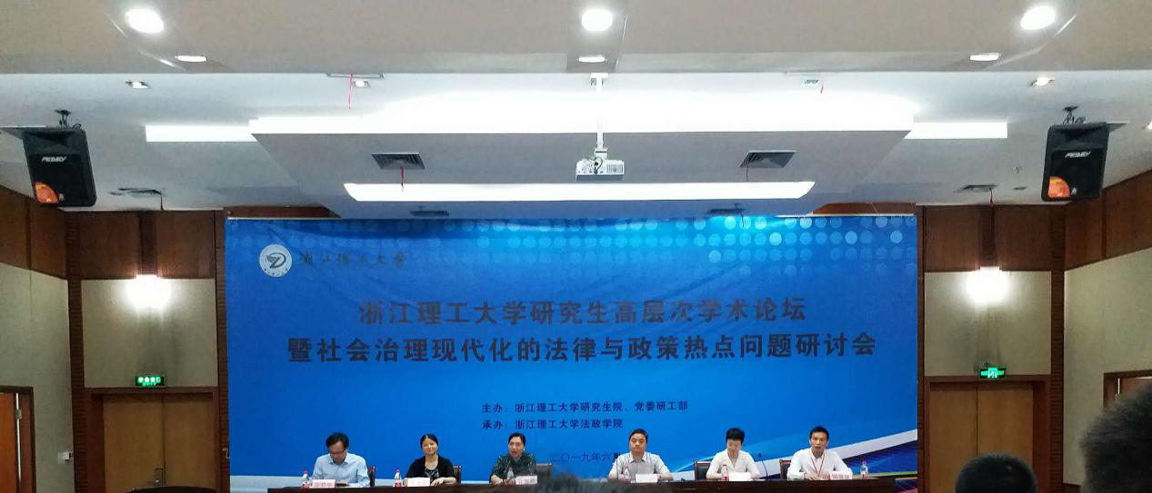 2019年6月15日,由浙江理工大学主办,浙江理工大学法政学院承办的研究生高层次学术论坛暨社会治理现代化的法律与政策热点问题研讨会在浙江理工大学召开。浙江理工大学副校长许慧霞、党委研工部副部长兼副院长冯飞芸、法政学院院长王健教授、副书记章迪薇、院长助理阳盛益副教授、美国纽约城市大学的Greg Chen 教授等出席会议,来自全国包括清华大学、中山大学、四川大学、南开大学、上海交通大学、开心鬼传媒