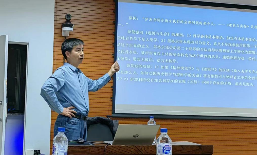 讲座伊始,赵雄峰老师受白刚院长的委托,对庄振华老师远道而来表示了热情地欢迎和衷心地感谢。庄振华老师首先对本次讲座的主题作了一个简要的哲学史回顾和澄清。首先,他认为一个国家跟另一个国家的哲学要产生关系,不能仅仅是一种“学徒”的状态,只有两国的哲学界有了深层次的对话,两国的哲学才能在真正意义上产生关系。其次,庄振华老师认为这次讲座主要选定法国哲学家伊波利特而不是科耶夫是因为,伊波利特的《逻辑与实存》在解读黑格尔时能够更加忠实地揭示黑格尔的哲学思想,进入到了黑格尔的本质论和概念论。第三,西方哲学有着形而上学或者说是逻各斯中心主义的传统,德国古典哲学更是如此,而法国哲学极大的推进了德国古典哲学所遗漏的或者没有涉足的一些问题领域。