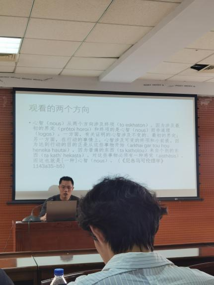 最后,樊黎老师借助工匠的比喻说明了观看与制作。工匠观看每一种家具的样式,从而制造出躺椅或桌子等,它是与观看和制作这两件事相关的。亚里士多德在《尼各马可伦理学》1032b6-12也指出,健康产生的始点和终点都是健康,不过前者是健康的样式,后者是现实的健康。并且,樊黎教授还借《形而上学》更清晰地指明了制作的问题:样式作为本原,思想从样式开始,制作从思想开始。最后,樊黎老师还指出,观看有两个方向,它不仅针对样式,还针对现实世界;不仅观看普遍事物,还观看个别事物。他提醒到,柏拉图在《理想国》501a称:“当他们完成他们的作品时,他们就将要频繁地向两边看”。