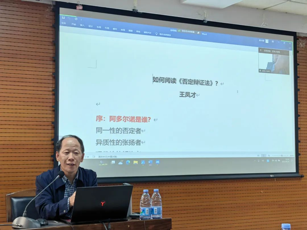 王凤才教授的讲座从“否定辩证法的由来”“否定辩证法的逻辑结构”“否定辩证法的核心思想”“否定辩证法评价”四个方面展开:讲述了阿多尔诺否定辩证法思想与黑格尔、马克思和早期法兰克福学派之间的关联,分析了阿多尔诺《否定辩证法》一书的形成始末和逻辑结构,概括了《否定辩证法》作为一种“反体系”的“体系”的四个方面——“非同一性”(NichtIdentität)的理论基础、反概念、反体系、反传统的基本特征,“被规定的否定”的核心、“瓦解的逻辑”的最终结局,合理地评价了阿多尔诺的否定辩证法思想与现代主义、理性主义、马克思主义、悲观主义之间的关系。