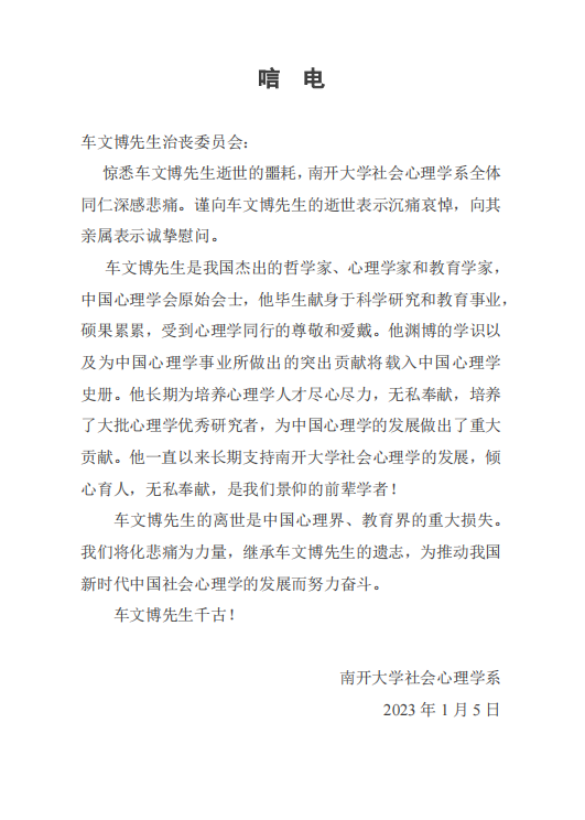 南开大学社会心理学系唁电