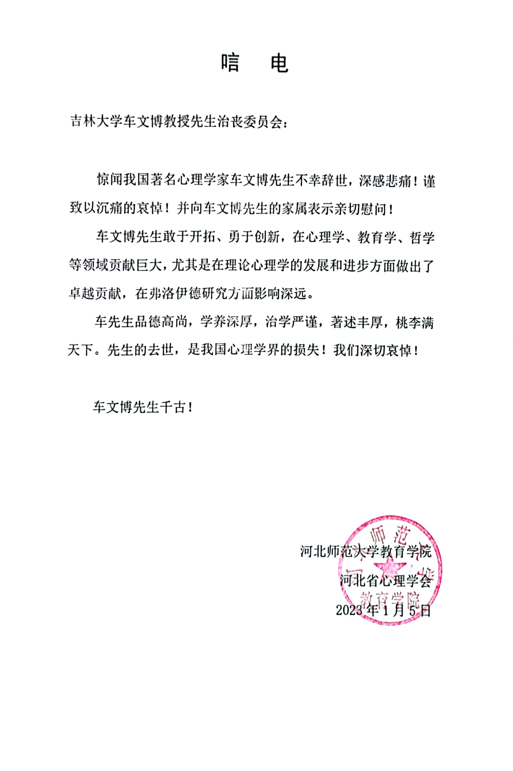 河北师范大学教育学院河北省心理学会唁电
