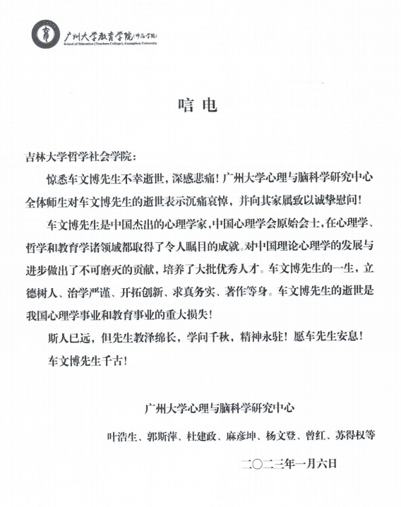 广州大学心理与脑科学研究中心唁电
