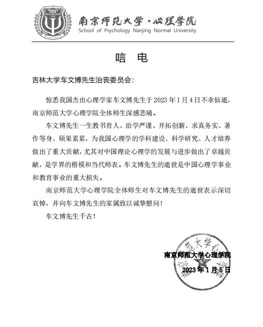 南京师范大学心理学院唁电
