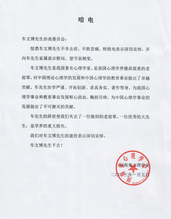河南省心理学会唁电